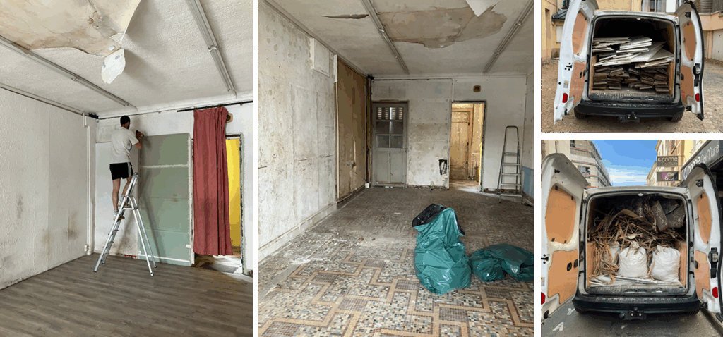 Vous reconnaissez Manu ? C’est comme ça qu’il a accepté d’occuper son jour de repos 😅 C’était le 31 mai : notre premier jour de chantier avec la dépose du parquet, des vieilles parois et les premiers allers/retours à la déchetterie !